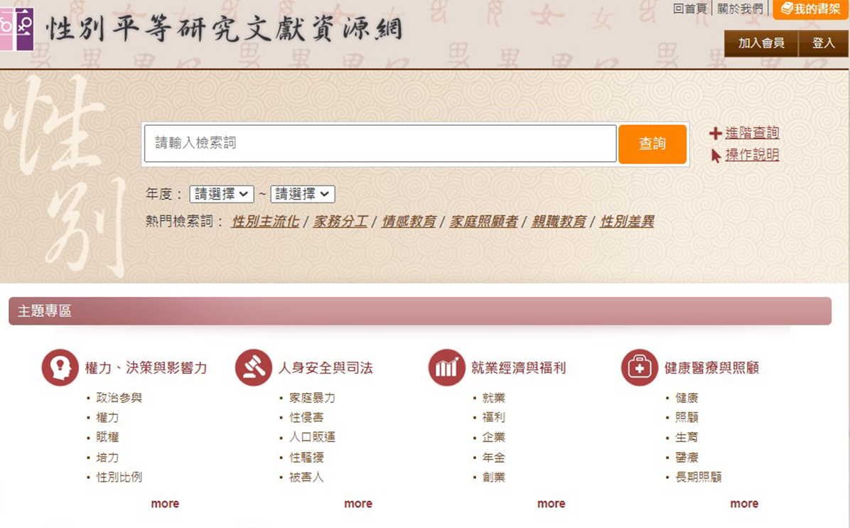 「性別平等研究文獻資源網」是由行政院性別平等處所建置性別平等知識整合之服務平臺,匯集國內外有關女性、男性、性別相關權益促進及其他議題之書籍、期刊、期刊論文、學位論文、學術研討會論文、公務出國報告、政府委託研究報告及視聽資料等文獻資料目錄,以一站式整合查詢服務,提供婦女、性別團體、專家學者、公務人員與社會大眾便利查閱及取得相關研究資料,促進性別研究資訊流通,並提供線上議題追蹤等會員個人服務,回應社會大眾對性別平等議題之關注,以培養具性別意識與興趣的知識社群。