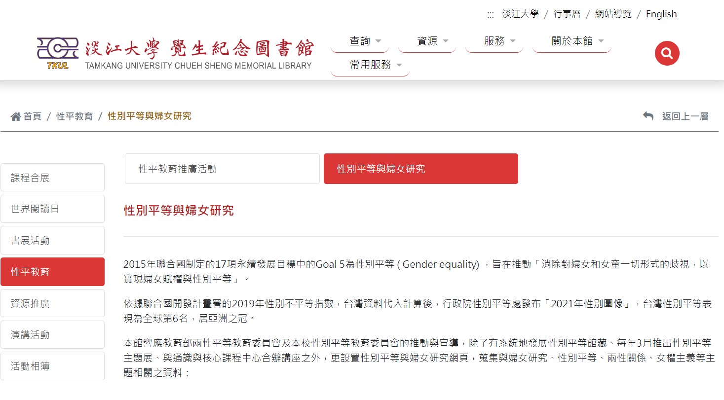 本網頁建置於90年3月,原始名稱為兩性平等,96年6月更改名稱為性別平等,並持續蒐集與婦女研究、性別平等、兩性平等、兩性關係、女權主義等主題相關之資料: