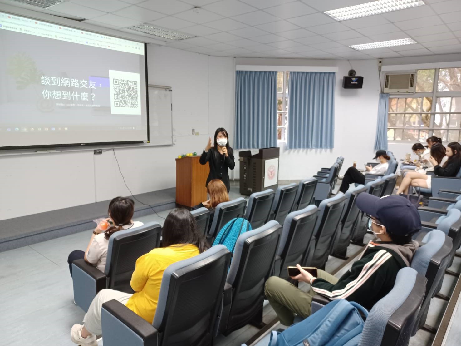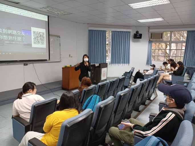 該主題共辦理兩場次講座,主要針對現今同學在使用網路交友的習慣、如何辨識風險訊息,以及幫助同學探索愛情依附類型、愛的語言等面向,增進人際交友和風險控管的概念。