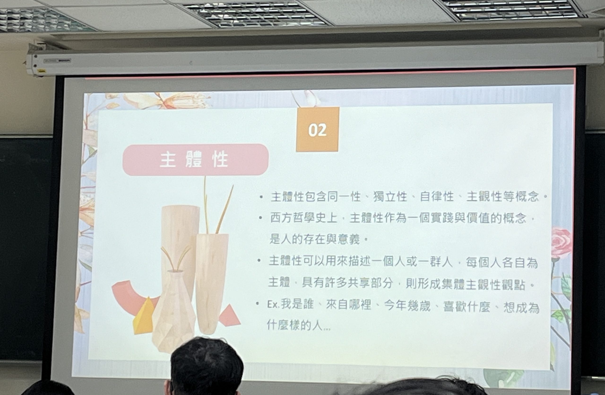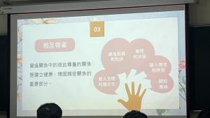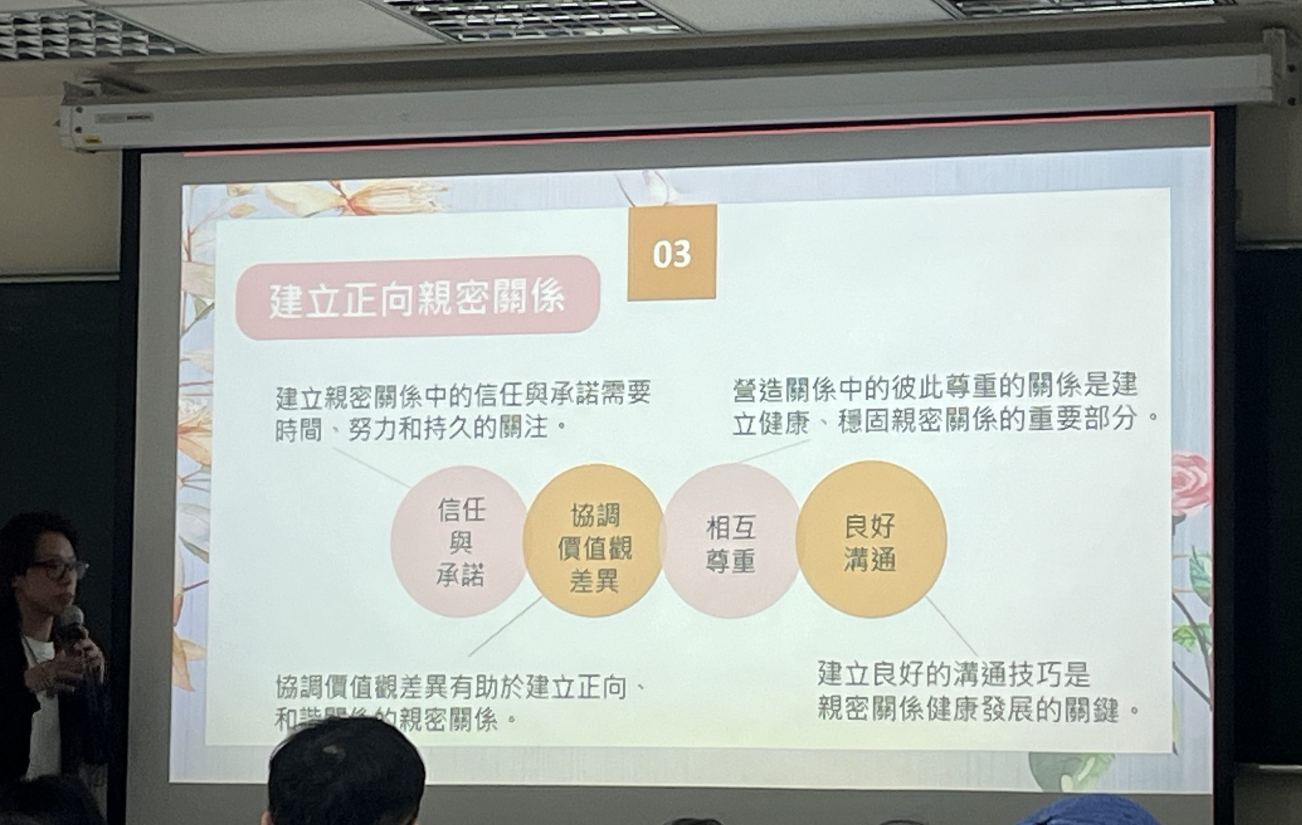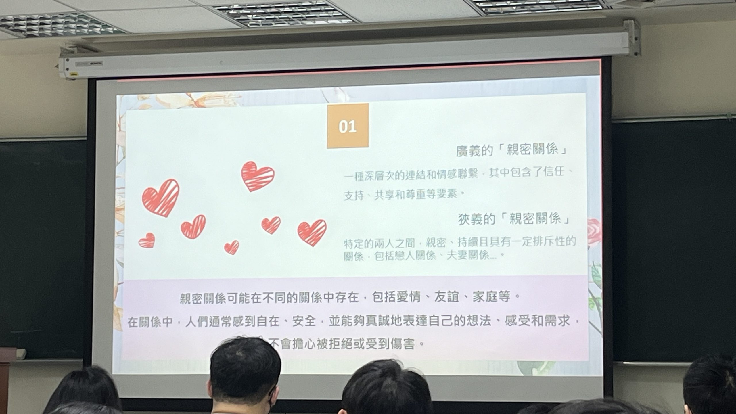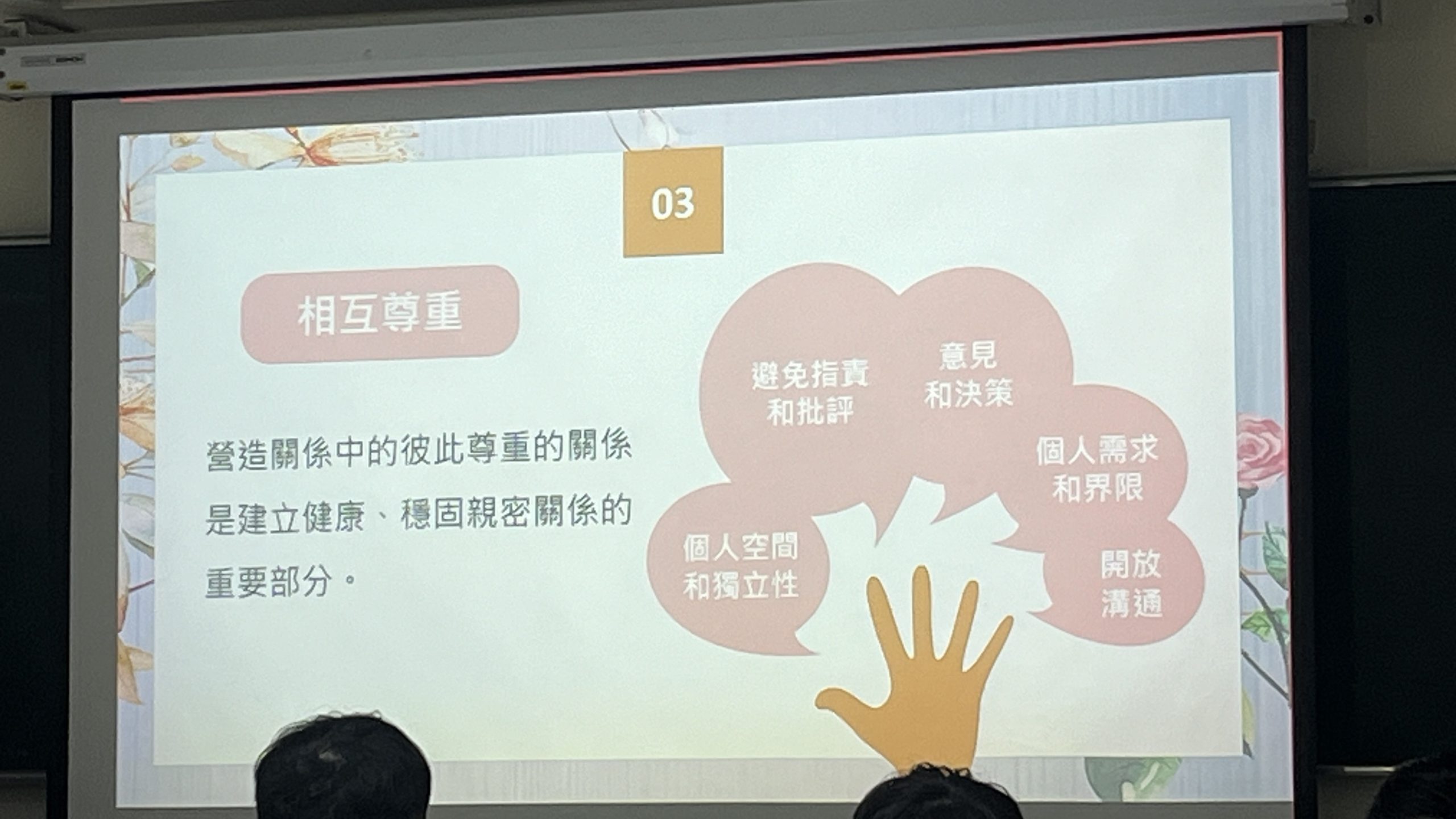 講師介紹親密關係的要素,鼓勵同學在關係中保有自我主體性,同時維持正向關係。